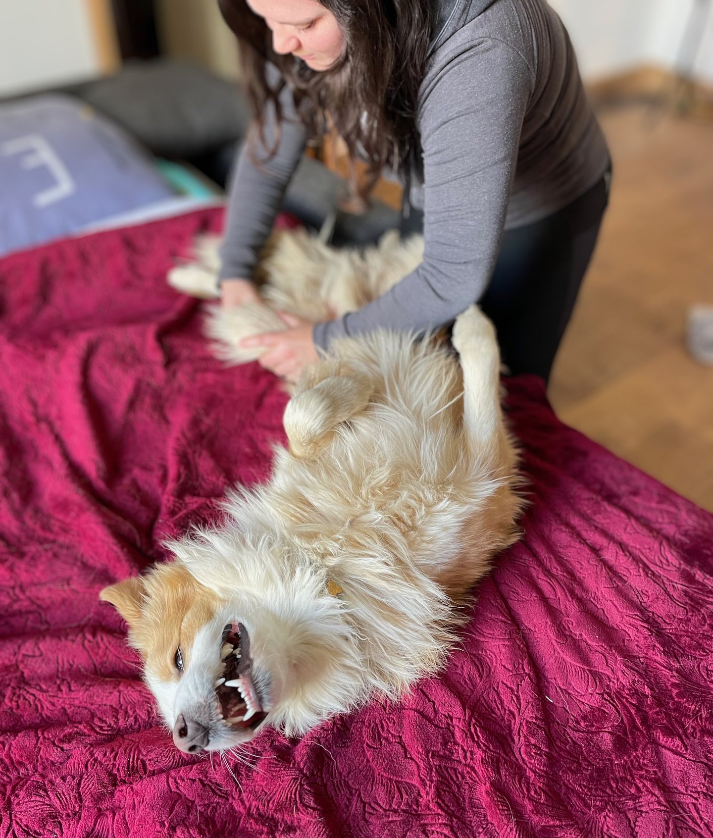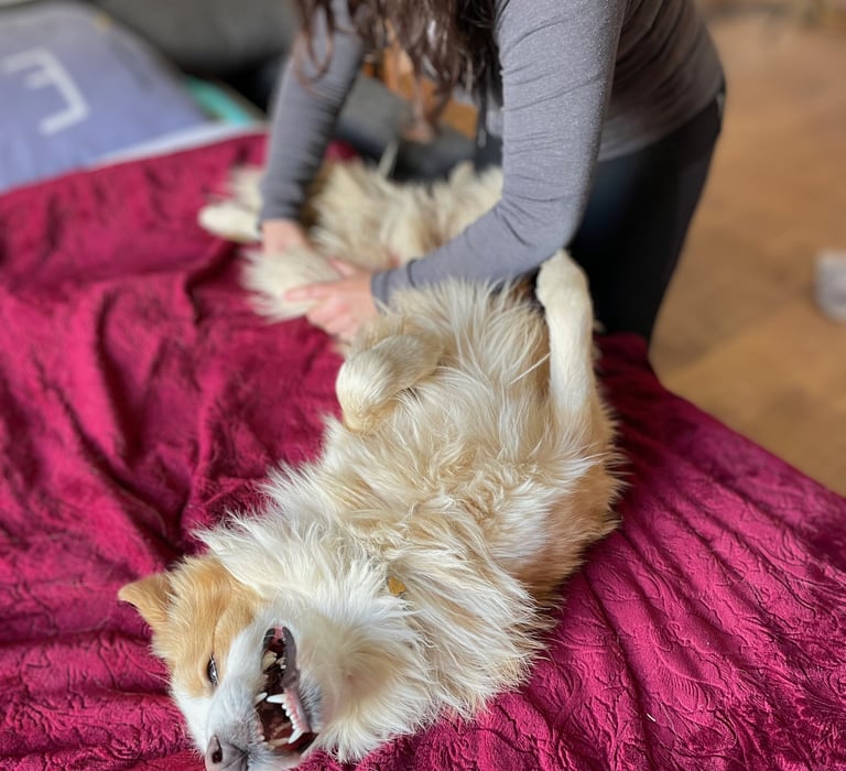 En effet, une zone complètement verrouillée pourra être abordée avec du massage ou des étirements pour faciliter le travail en ostéopathie ainsi que pour le confort de votre animal.